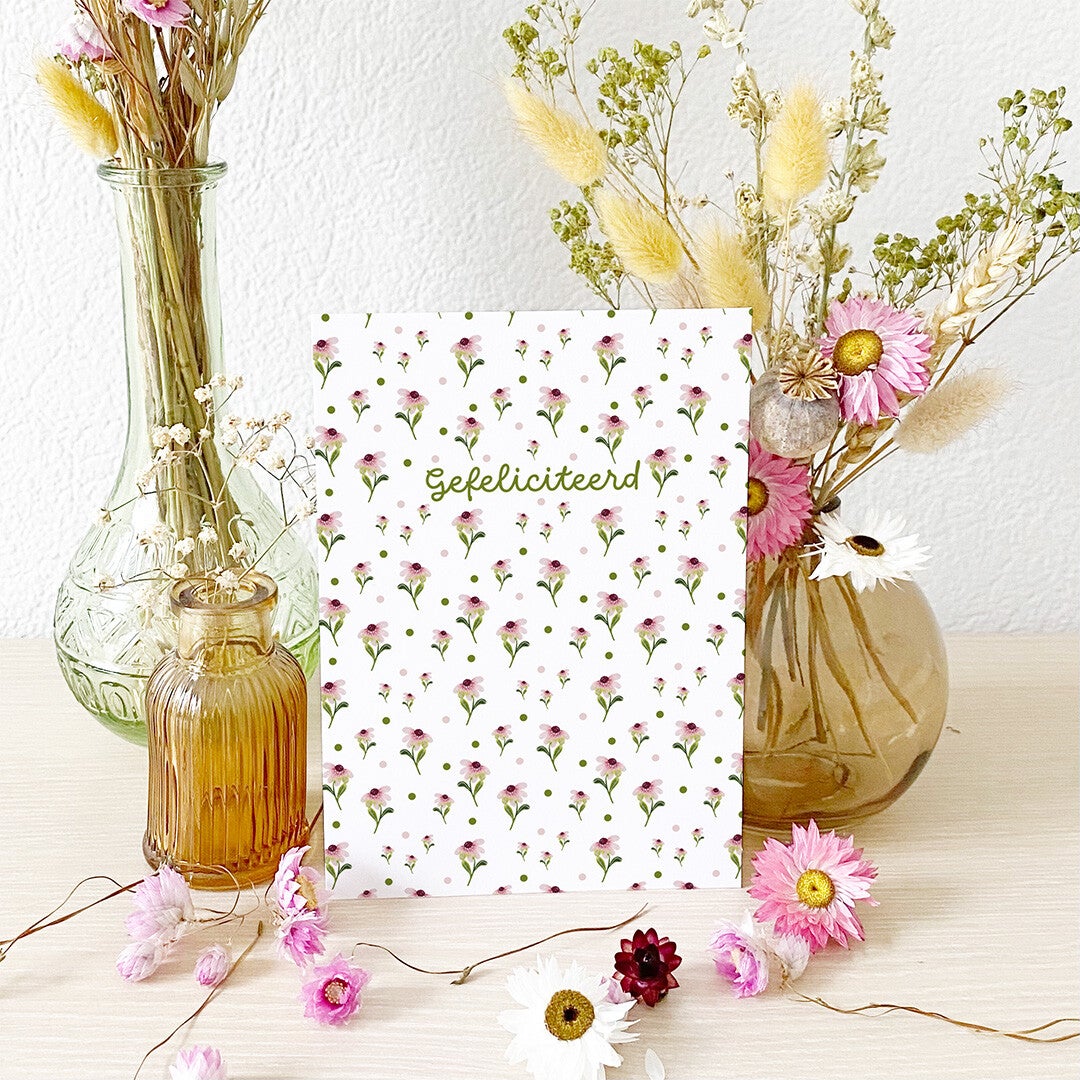 Wenskaart 'Gefeliciteerd' met motief van de zomerbloeier Zonnehoed! Feliciteer iemand met dit zomerse romantische wenskaartje. Deze kaart is onderdeel van de zomercollectie 2025.