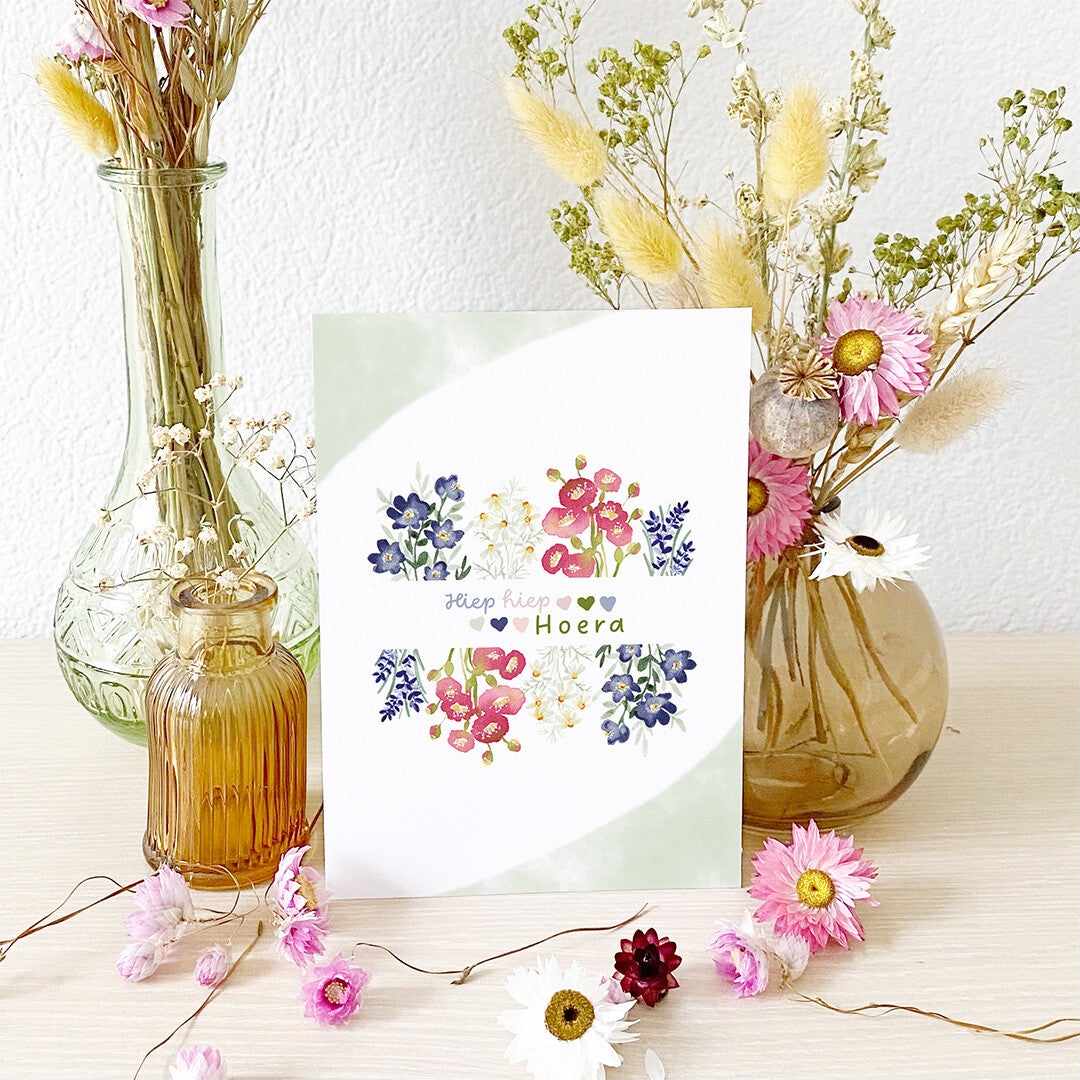 - Wenskaart Hiep hiep hoera met kleurrijke zomerbloeiers