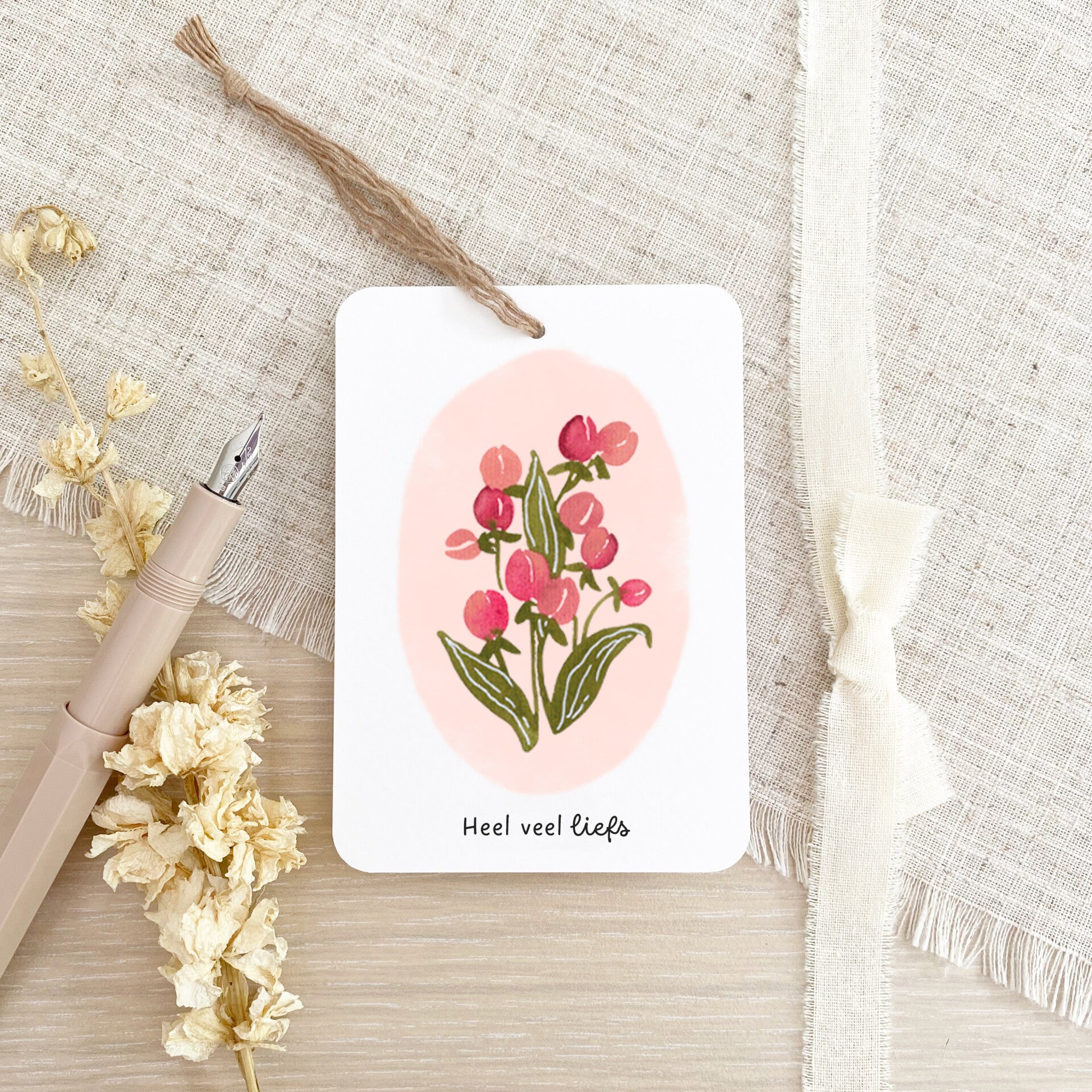 - Kaartje 'Heel veel liefs' met zachtroze achtergrond en roze tulpen